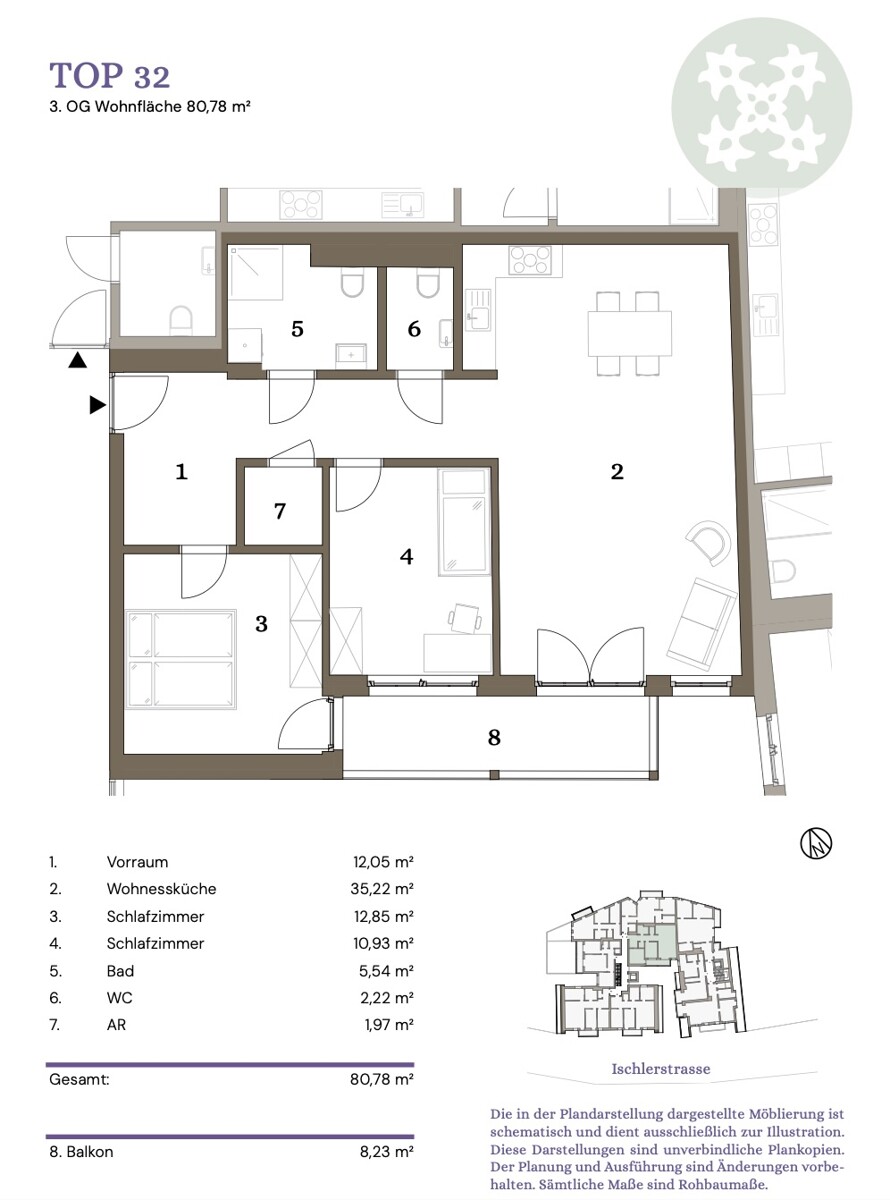Das Appartement „TOP 32“ befindet sich im 3. Obergeschoss und ist mit dem Personenaufzug sowohl vom Erdgeschoss als auch von der Tiefgarage aus bequem erreichbar. Beim Betreten der Wohnung gelangen Sie durch einen geräumigen Vorraum mit WC, einem Bad mit Dusche und einen Abstellraum auch zu den zwei geräumigen Schlafzimmern und dem großzügigen Wohn-Küchen-Essbereich. Durch die großen Fensterfronten wirkt der Wohnraum hell und einladend. Der angrenzende Balkon verwöhnt Sie mit angenehm frischer Luft und einem wunderbaren Bergpanorama zum Genießen.