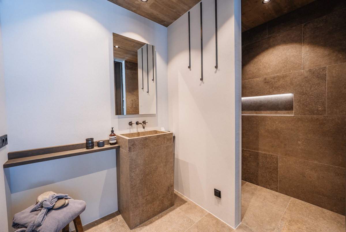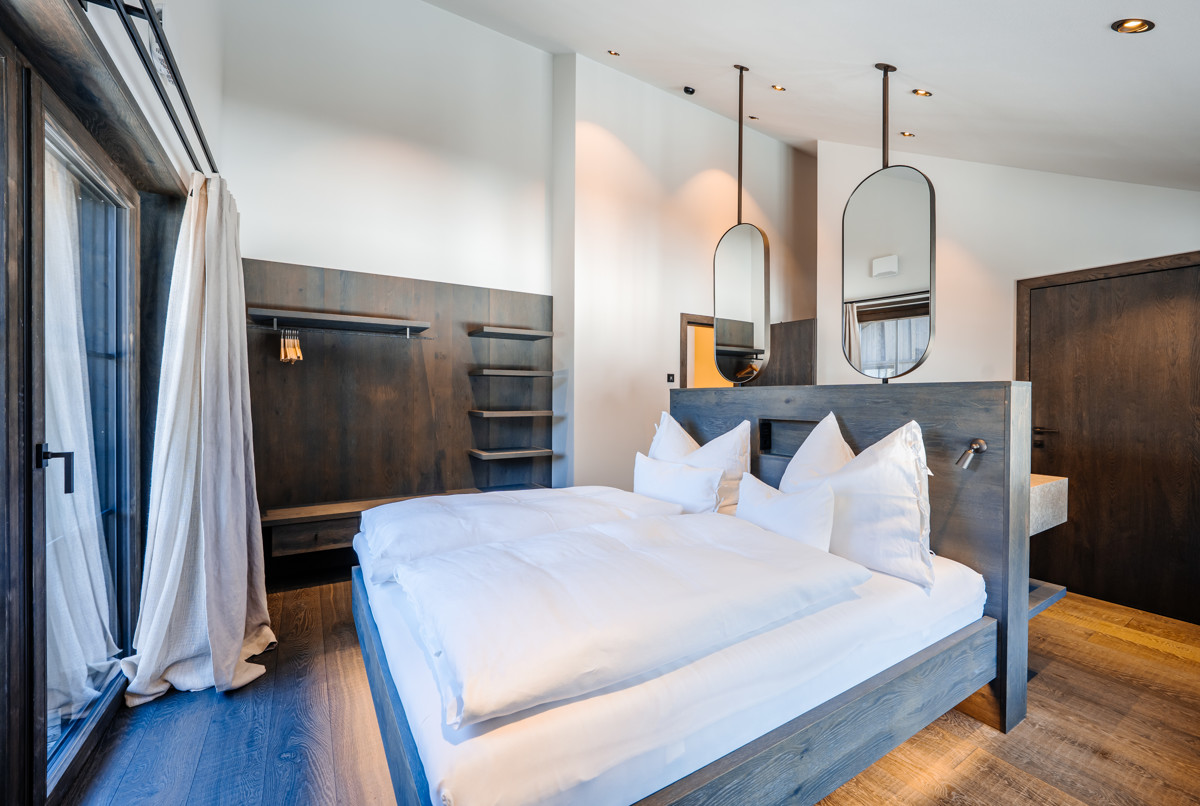 Die Lodge Felsenbirne ist in sanften Naturtönen gestaltet und erstreckt sich auf zwei Etagen mit einer Wohnfläche von ca. 79 m². Es erwartet Sie ein eleganter Masterbedroom mit offenem Badezimmer inklusive einer XL-Duschen sowie ein privater Garten mit Sauna und Hot-Pot. Hier genießen Sie pure Entspannung und den atemberaubenden Blick auf die umliegende Bergwelt.