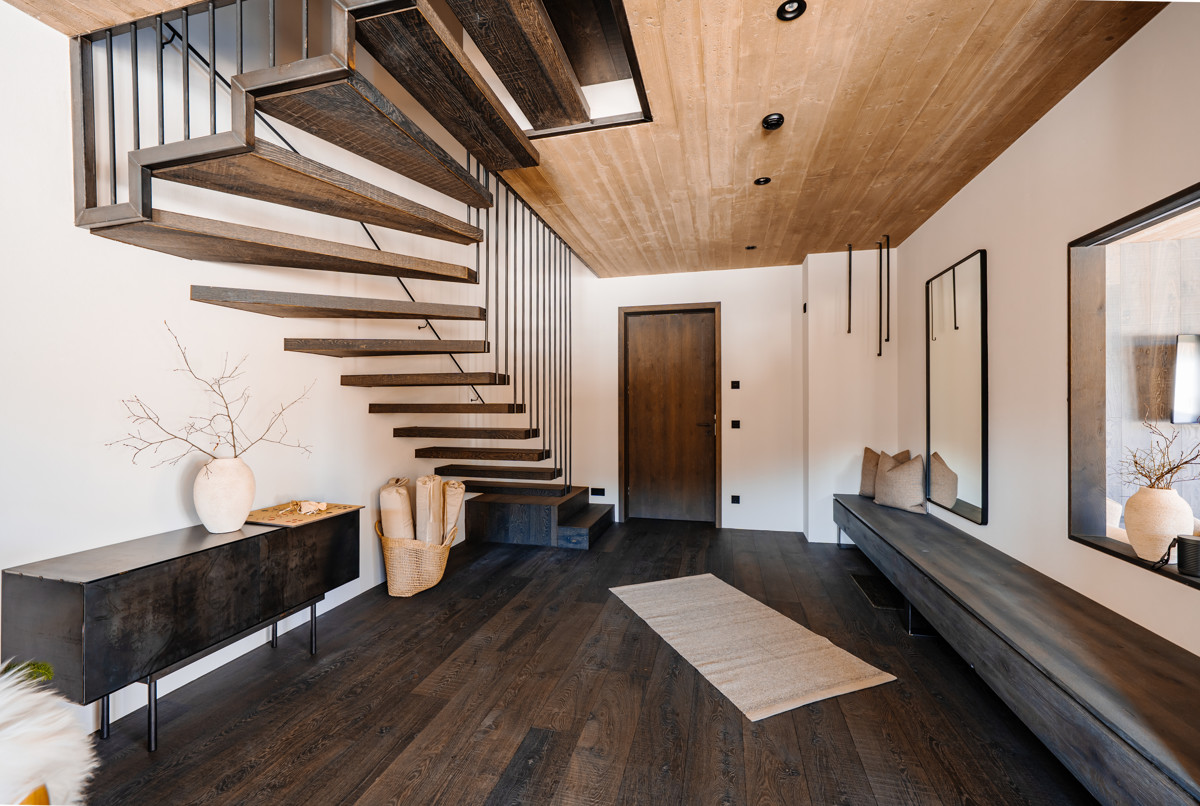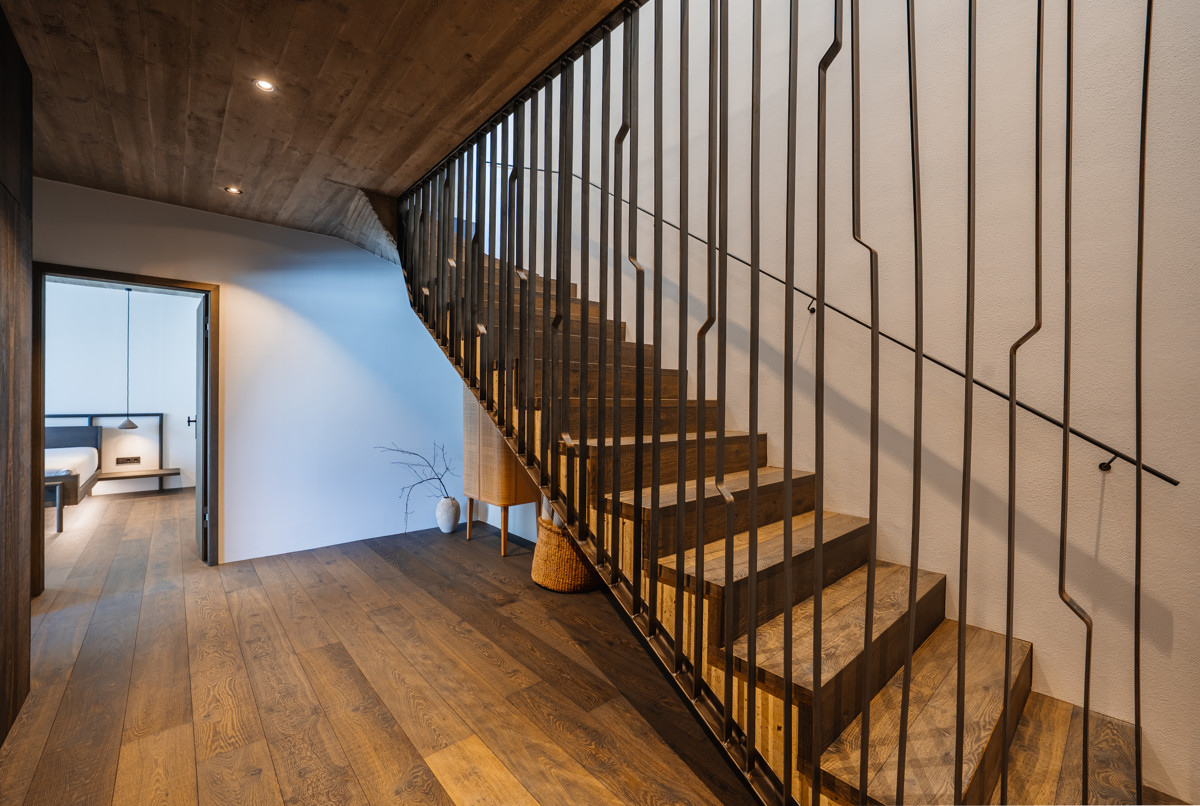• Sichtbetondecken, freischwebende Holzstiege mit Metallelementen und bündig einschlagende Türen