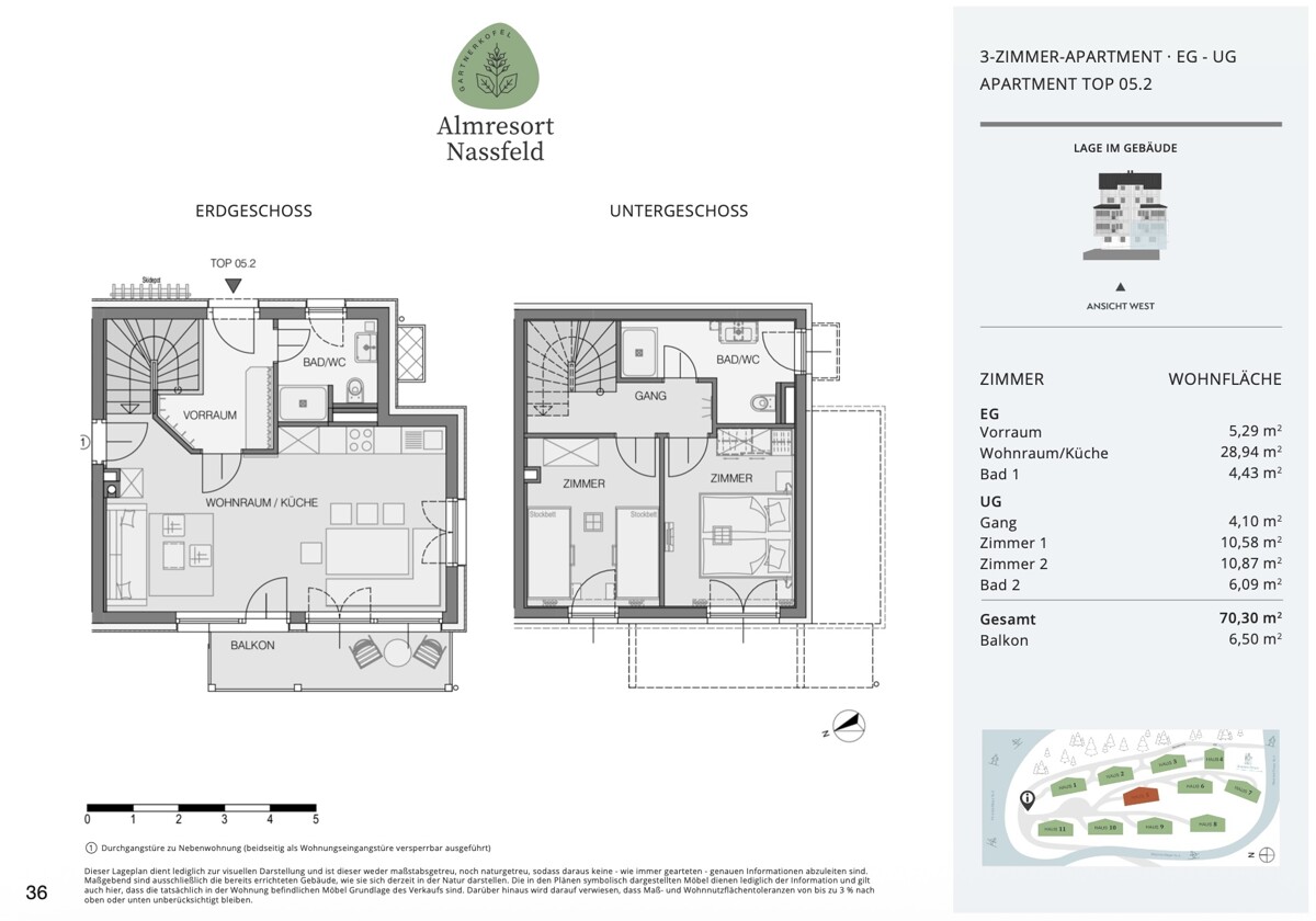 Das Family Chalet für 6–8 Personen überzeugt mit einer optimalen Raumaufteilung auf zwei Ebenen (UG & EG) und einer Wohnfläche von rund 70,30 m². Zwei separate Schlafzimmer – eines mit Doppelbett, eines mit Doppelstockbett – bieten Rückzugsorte für Groß und Klein. Zwei geschmackvoll gestaltete Badezimmer mit Dusche und WC bieten Raum für entspannte Morgenroutinen und erholsame Auszeiten nach einem aktiven Tag in den Bergen.