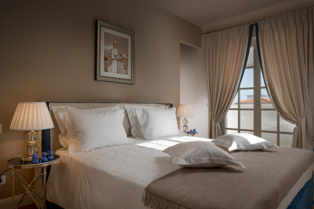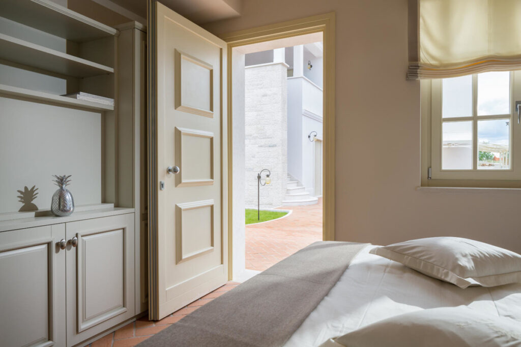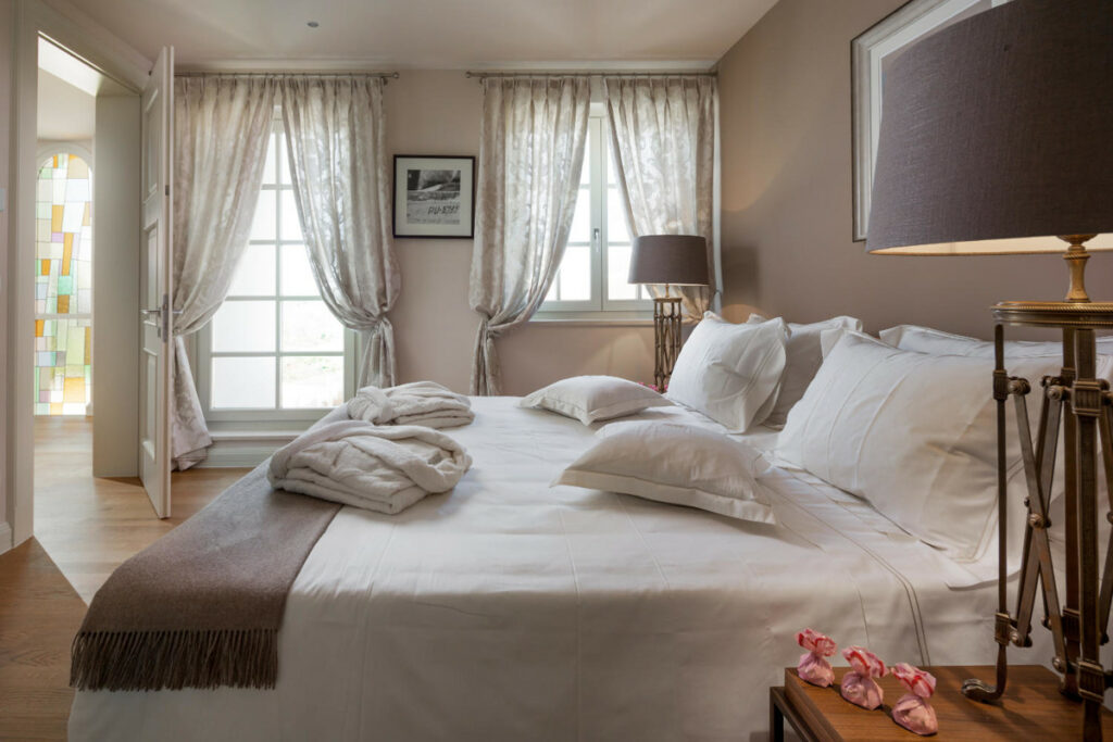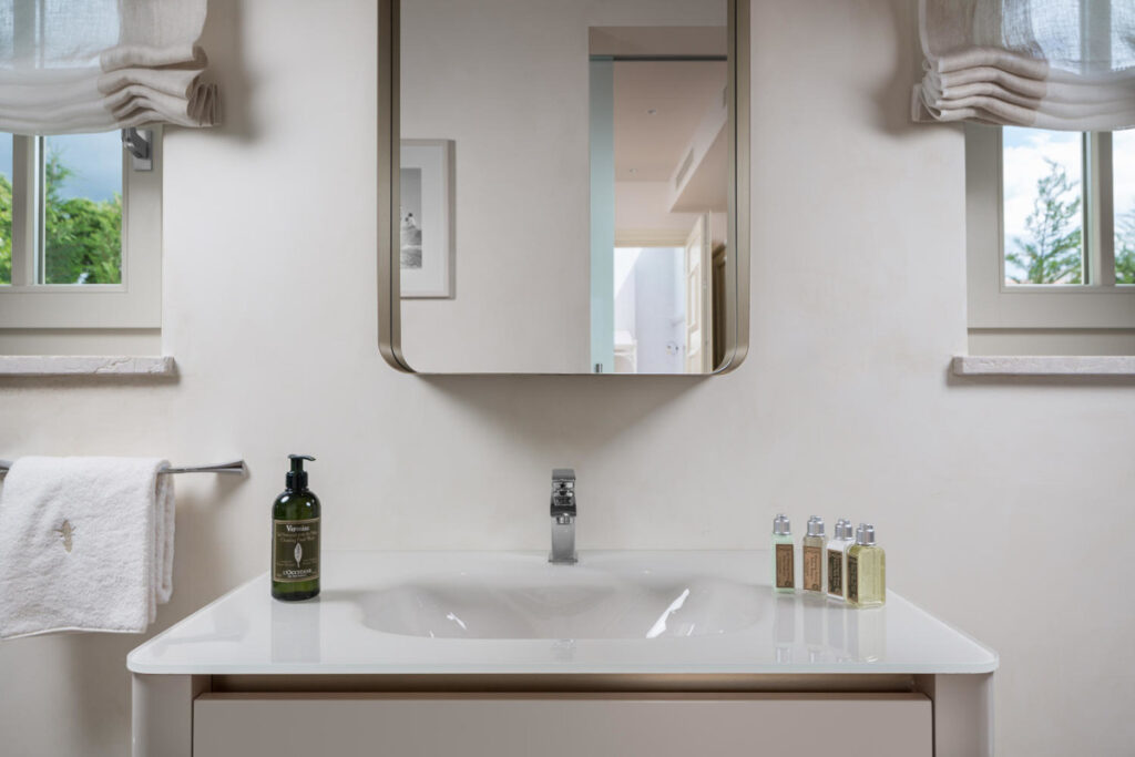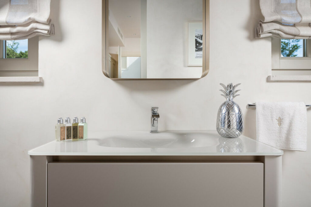Die Immobilie umfasst zudem ein separates Gästehaus mit zwei Schlafzimmern und eigenem Bad. Genau wie das Haupthaus sind auch hier die Räume in sanften, neutralen Farbtönen gehalten. Der Garten ist von hohen Hecken umgeben und bietet maximale Privatsphäre.