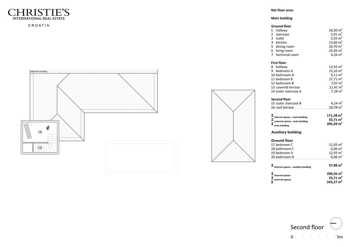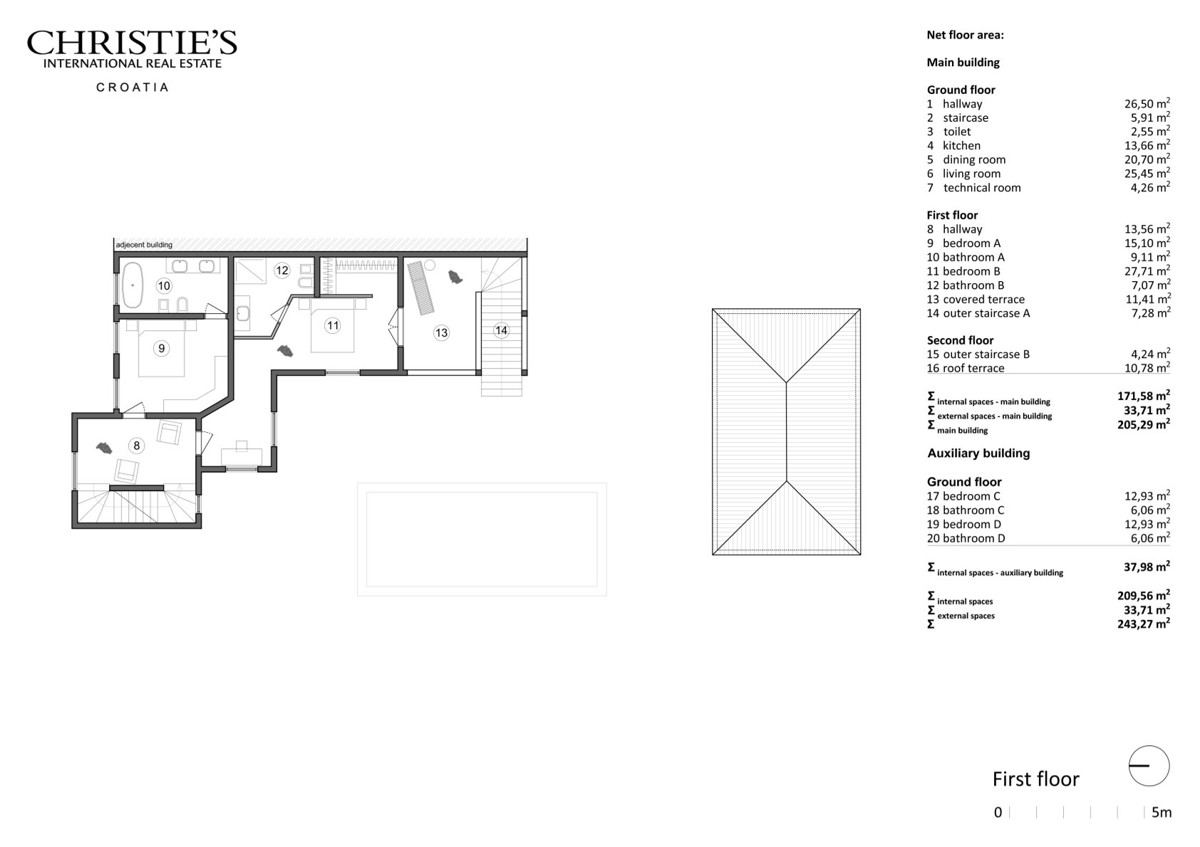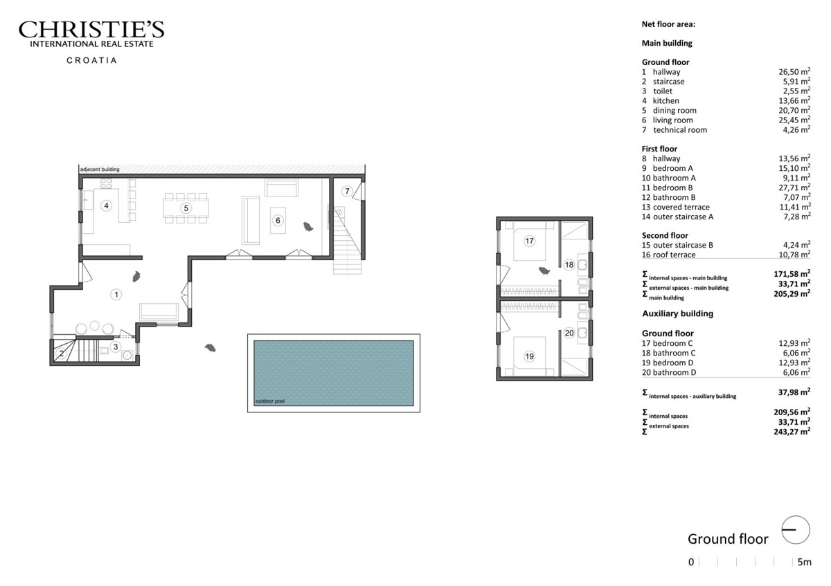 Insgesamt umfasst die bebaute Fläche 277 m², einschließlich 210 m² Innenfläche, 34 m² Terrassen und einem 34 m² großen Außenpool.