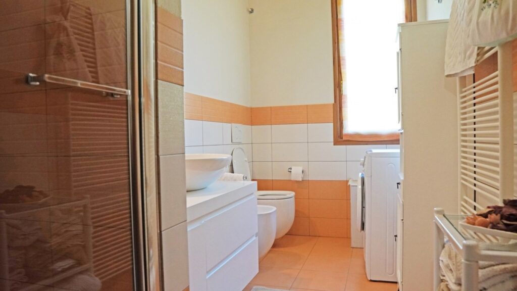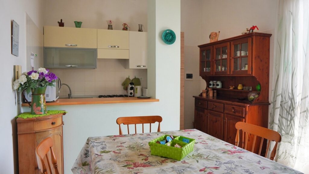 Das Erdgeschoss, das derzeit vermietet ist, beherbergt eine zweite Küche, einen Wohnbereich, zwei Schlafzimmer, ein Badezimmer, einen praktischen Abstellraum und einen Technikraum, der auch als Waschküche genutzt wird.