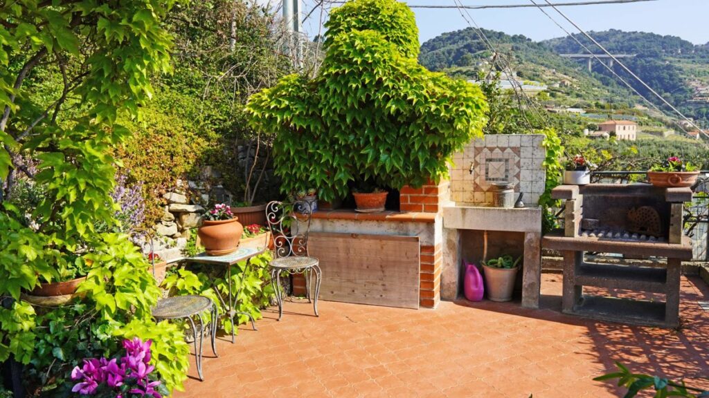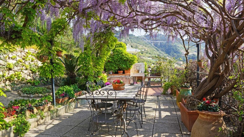 Der private Garten mit Meerblick ist ein wahres Juwel: groß, gepflegt und voller malerischer Ecken. Auf der einen Seite öffnet sich ein freier Bereich mit Obstbäumen und einem praktischen Bewässerungsbecken. Auf der anderen Seite befindet sich ein Essbereich im Freien, der von einer mit Glyzinien bewachsenen Veranda geschützt ist, die im Frühling mit ihrer spektakulären Blüte und einer einzigartigen Atmosphäre begeistert.