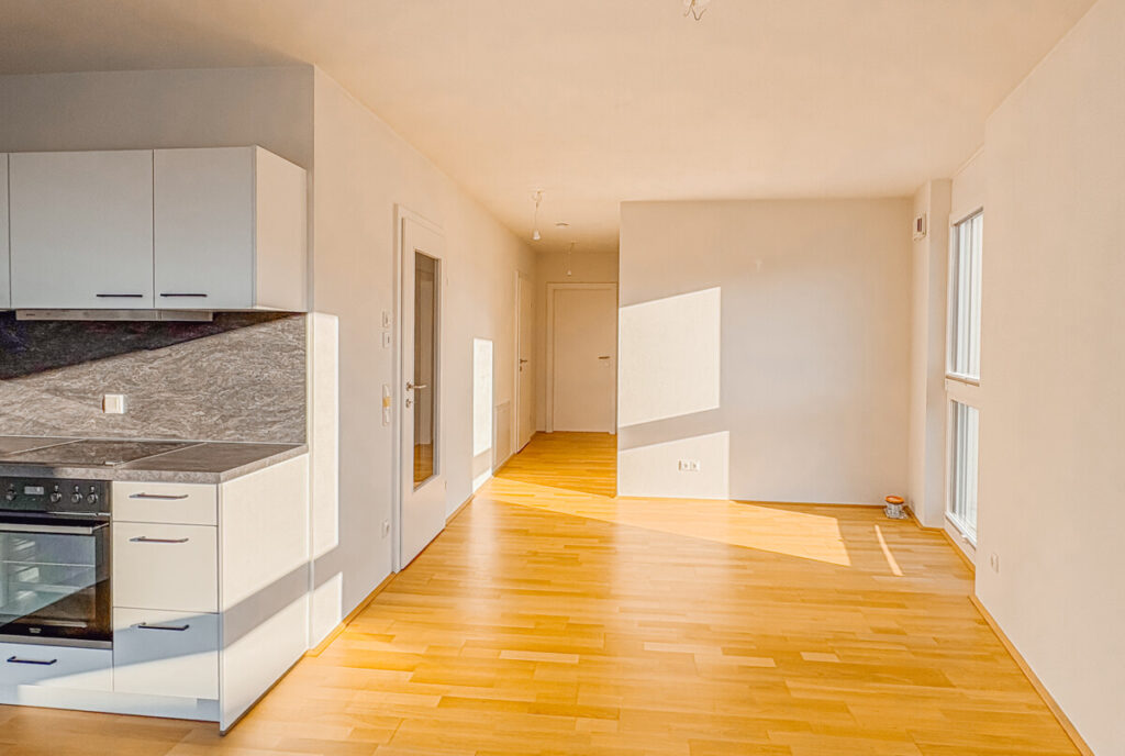 Bereits beim Betreten der Wohnung empfängt Sie ein einladender Vorraum, der ausreichend Platz für einen stilvollen Garderobenschrank bietet. Von hier aus öffnet sich der helle und großzügig gestaltete Wohn-Essbereich, der durch zwei bodentiefe Südfenster sowie eine große Fensterfront mit Balkontüre in Westausrichtung von Licht durchflutet wird. Diese harmonische Kombination verleiht dem Raum eine besonders freundliche, luftige Atmosphäre.