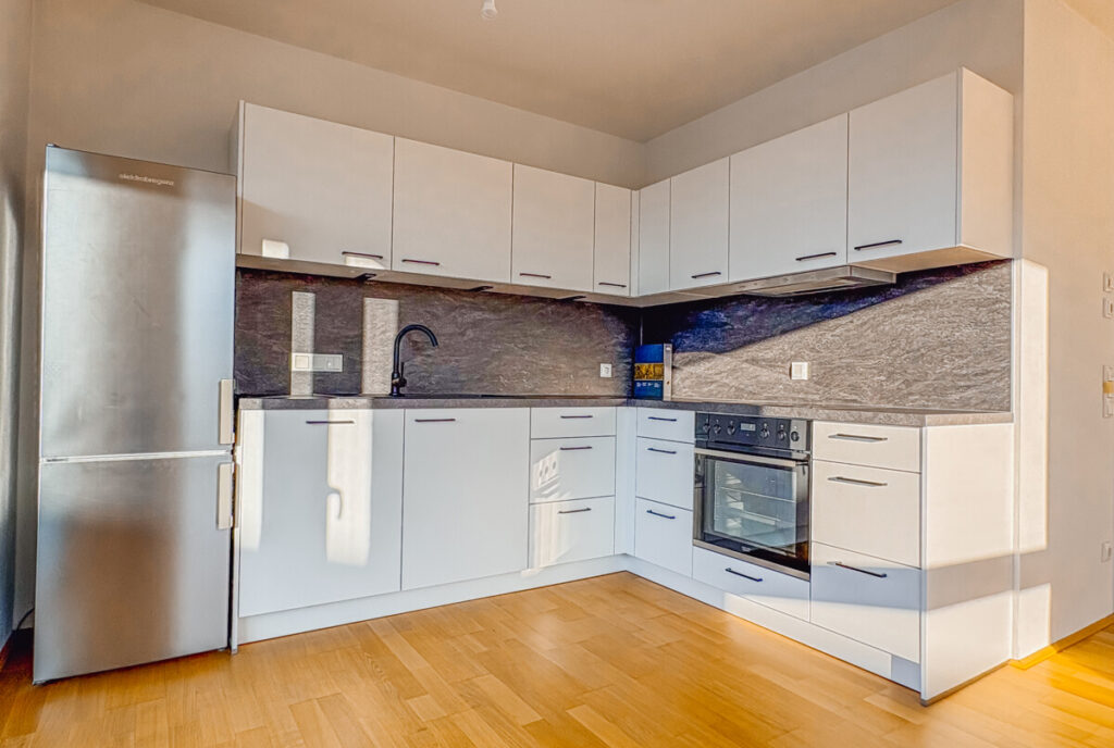 Vom Schlafzimmer aus gelangt man in einen praktischen Abstellraum, der sich hervorragend als begehbare Garderobe nutzen lässt. Die zeitlos moderne Einbauküche befindet sich in einem äußerst gepflegten, nahezu neuwertigen Zustand und wurde erst vor zwei Jahren von den Vormietern eingebaut. Ausgestattet mit freistehendem Kühlschrank, Geschirrspüler, Cerankochfeld und Backofen präsentieren sich alle Geräte kaum genutzt und wie neu.