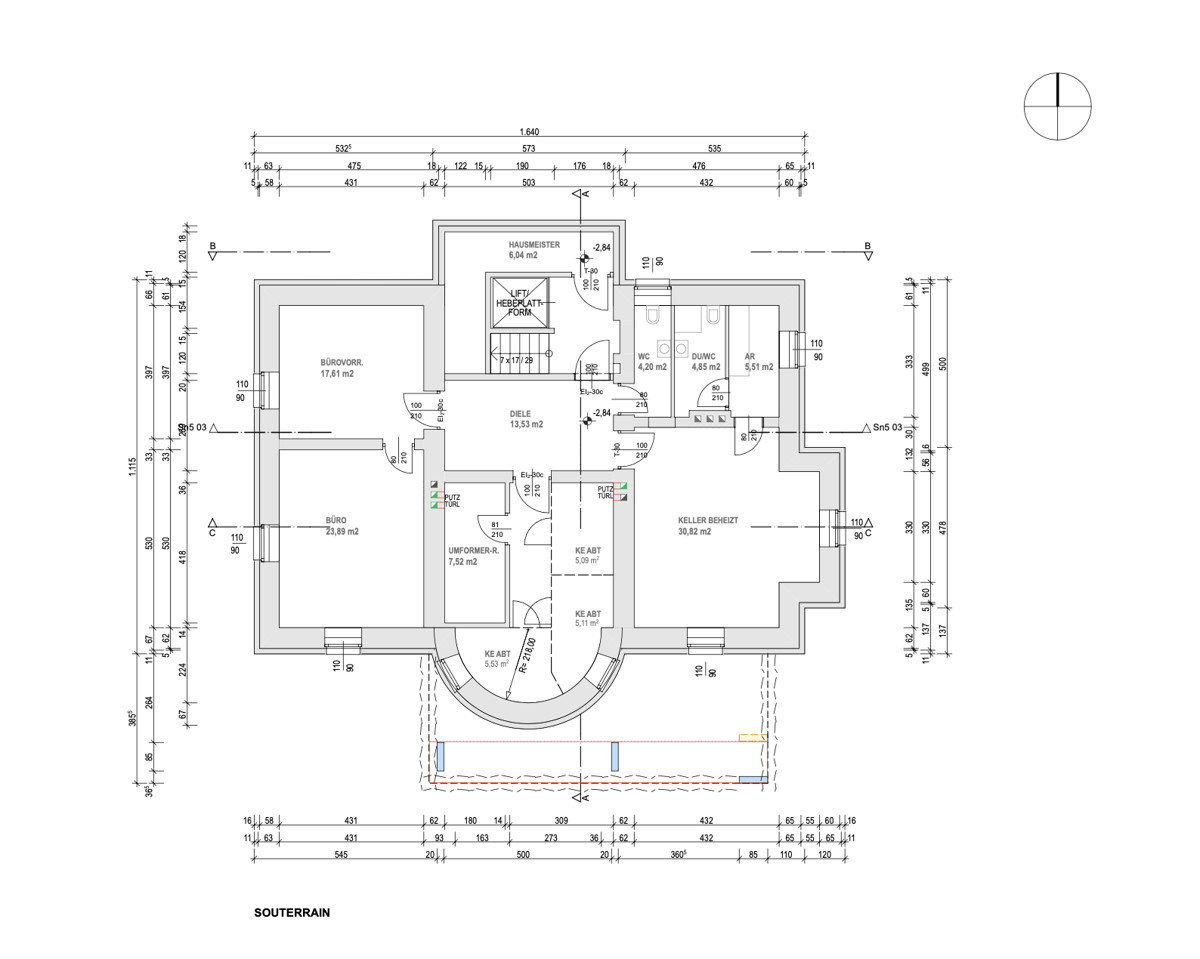 Der hochwertig ausgebaute Keller bietet vielseitige Nutzungsmöglichkeiten. Im Untergeschoss findet sich ein Büro, ein Bürovorraum, ein beheizter Kellerbereich mit Küche und Bad, ein Gäste-WC, die Haustechnik und mehrere abgeschlossene Abteile.