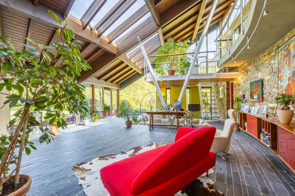 Dank der riesigen Fenster bietet sich aus diesen Räumen ein beeindruckender Blick auf den Garten und den privaten Wald: eine perfekt gelungene Verbindung zwischen dieser hochwertigen Realisierung und der umgebenden unberührten Natur, die sich romantisch bis zu den umliegenden Hügeln und Dörfern erstreckt.