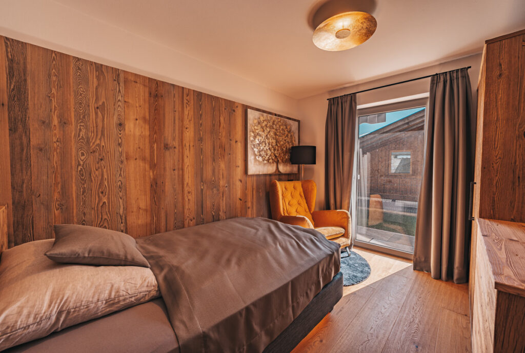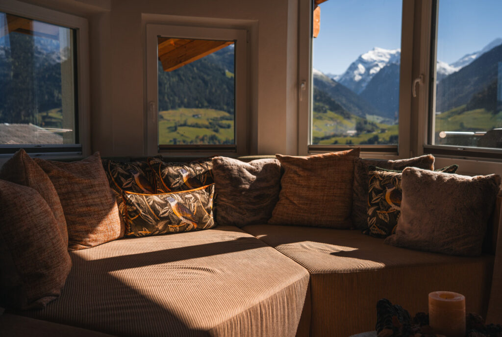 Nur wenige Stufen führen hinunter in das stilvolle Wohnzimmer. Hier verwandelt der gemütliche, dreiseitige Kaminofen kalte Winterabende in puren Genuss. Der offene Sichtdachstuhl gibt dem Raum zusätzlich Weite und verleiht ihm ein alpines Flair, während der gemütliche Erker mit integrierter Liegefläche den perfekten Platz zum Entspannen oder kuschelige Familienabende bietet. Die angrenzende, windgeschützte Terrasse lädt dazu ein, den atemberaubenden Ausblick auf die umliegenden Berge auch im Freien zu genießen.