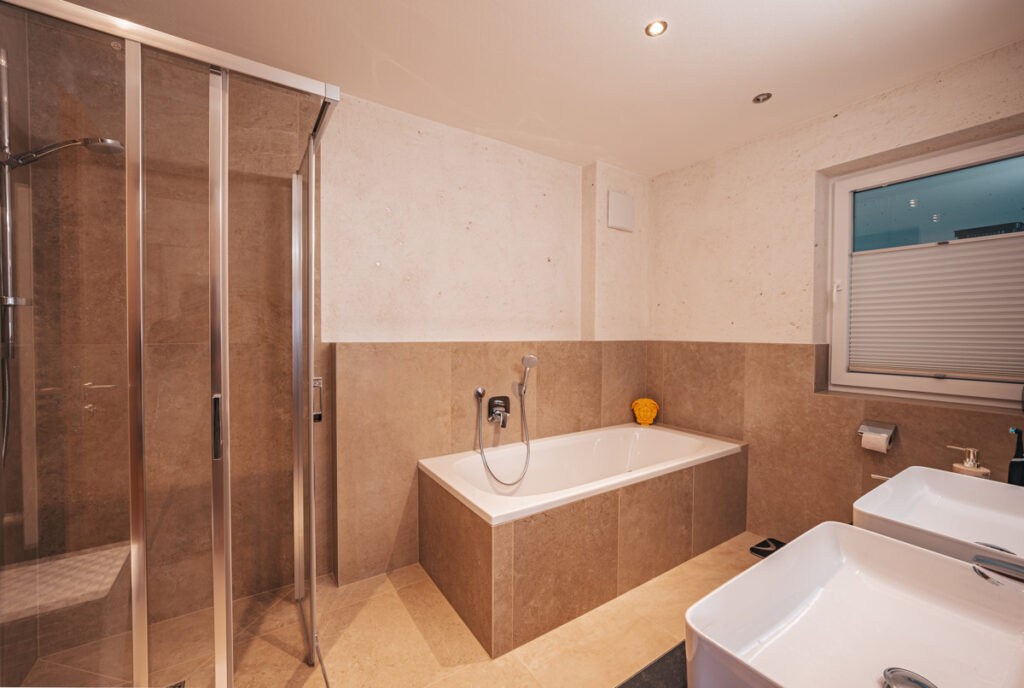 Im Obergeschoss befinden sich zwei exklusive Schlafzimmer, die durch die versetzten Ebenen ein Höchstmaß an Privatsphäre bieten. Das nördlich gelegene Schlafzimmer verfügt über ein eigenes Bad mit Badewanne, separater Dusche, Doppelwaschbecken und WC. Das südliche Schlafzimmer bietet durch den Erker und den direkten Zugang zur sonnigen Terrasse einen besonderen Charme und ist ebenfalls mit einem eigenen Bad mit Dusche und WC ausgestattet.