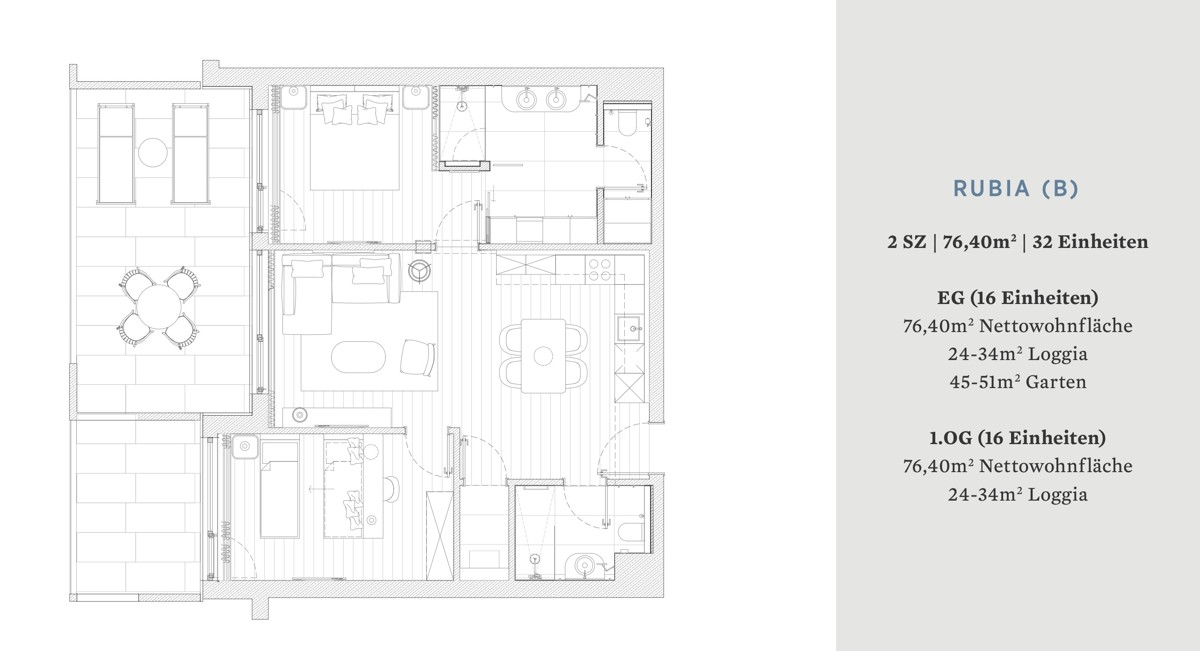 Das Appartement „Rubia“ bietet Raum für gemeinsame Zeit und zugleich Rückzugsmöglichkeiten für persönliche Momente. Auf 76,4 m² verteilen sich zwei Schlafzimmer, ein offener Wohn-Küchen-Essbereich und durchdachte Übergänge zwischen Innen- und Außenbereichen. Im Erdgeschoss wird der private Garten zur Erweiterung des Wohnzimmers – ein grünes Zimmer unter freiem Himmel. Von den oberen Etagen blicken Sie entspannt von Ihrer Terrasse auf die Küstenlandschaft. Auch hier stehen zwei stilvolle Designlinien zur Auswahl, die das besondere Ambiente unterstreichen und auf natürliche Materialien, feine Texturen und eine klare, zeitlose Ästhetik setzen. Die Entscheidung fällt nicht leicht – die Beispielbilder helfen Ihnen bei der Auswahl.