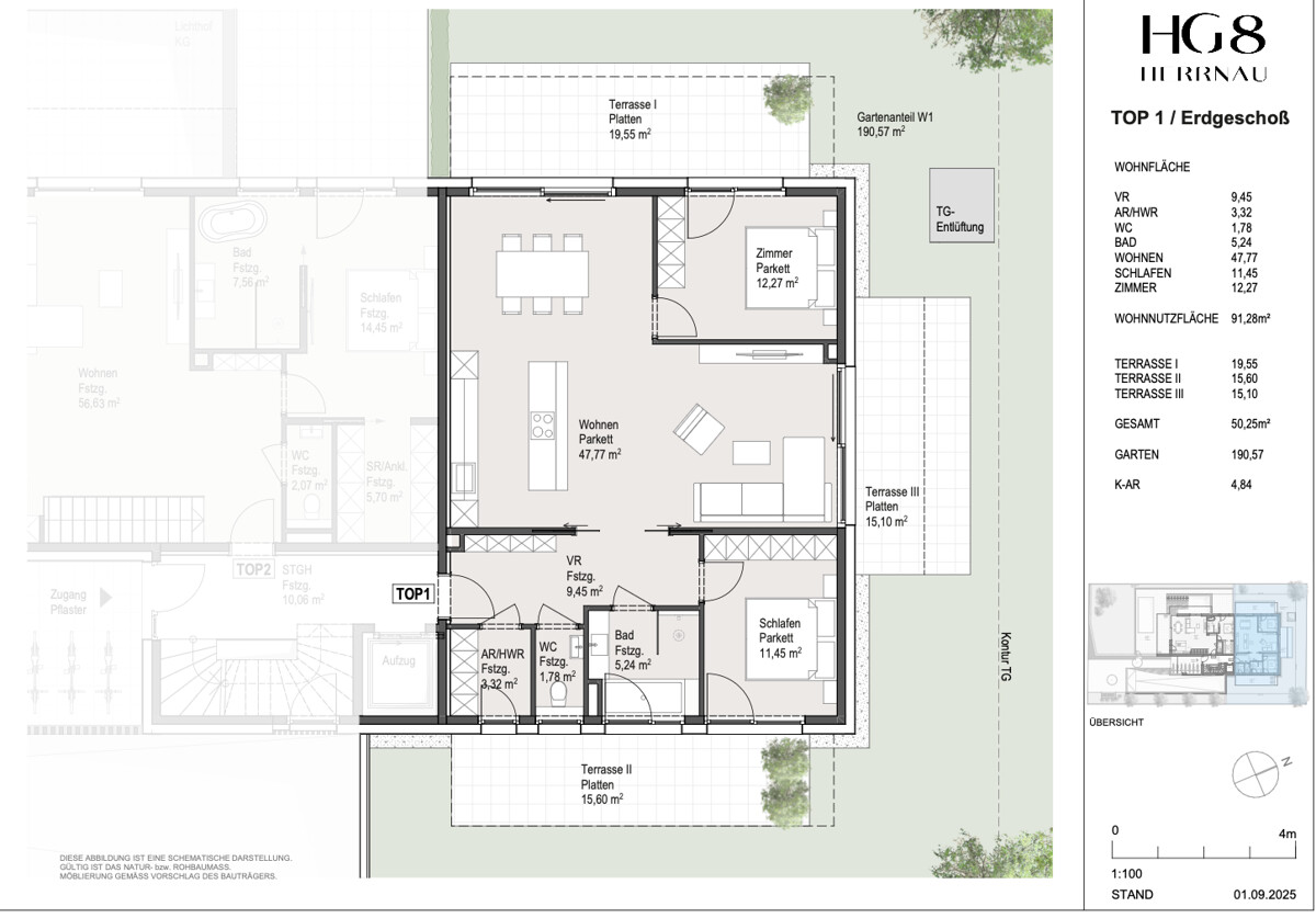 Die Wohnung Top 1 verfügt über eine Gesamtwohnfläche von 91 m² und bietet ein außergewöhnliches Raumgefühl. Herzstück ist der großzügige Wohn-, Ess- und Küchenbereich, der durch seine Offenheit und großen Fensterfronten ein luftig-leichtes Indoor-Outdoor-Feeling schafft.