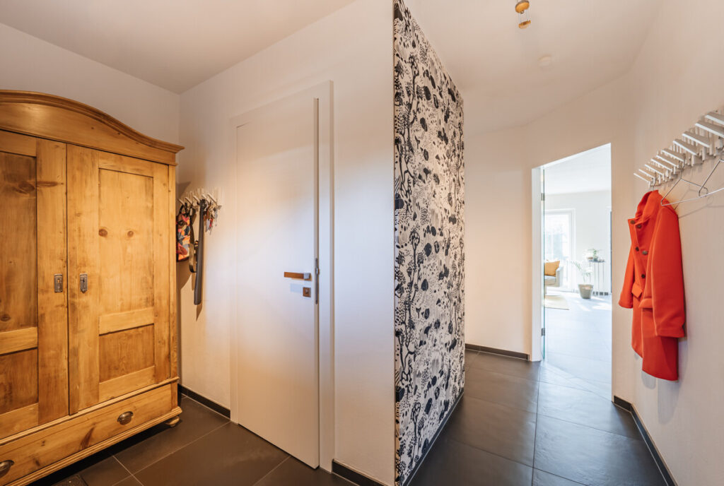 Im Obergeschoss befinden sich drei Schlafzimmer, die flexibel genutzt werden können. Neben einem Hauptschlafzimmer lassen sich hier problemlos Kinderzimmer, ein Gästezimmer oder auch ein Homeoffice einrichten. Große Fenster sorgen auch in diesen Räumen für viel Tageslicht und eine freundliche Atmosphäre.