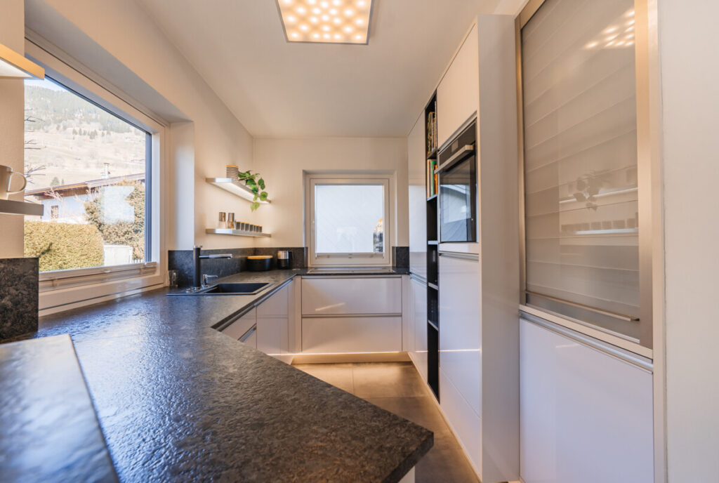 Die moderne Einbauküche fügt sich harmonisch in den Wohnbereich ein und ist funktional gestaltet. Sie bietet ausreichend Platz zum Kochen, Arbeiten und für das tägliche Familienleben. Durch die offene Verbindung zum Essbereich bleibt man auch beim Kochen immer Teil des Geschehens.