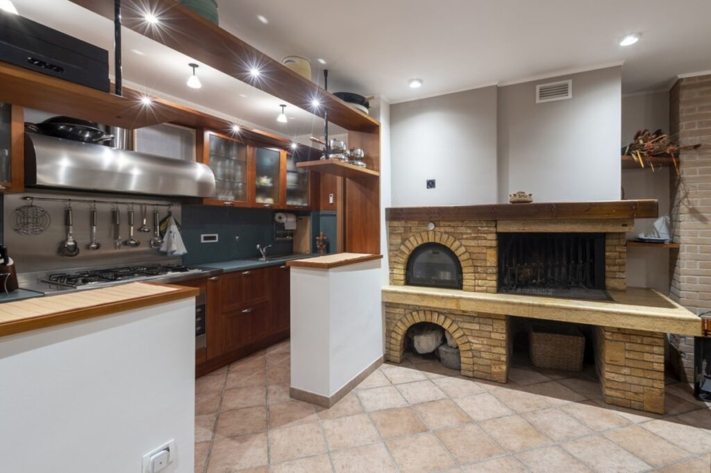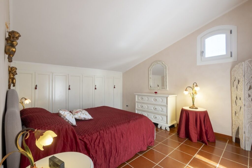 Eine Innentreppe führt in die obere Etage, wo sich zwei Schlafzimmer, eine Panoramaterrasse, ein Badezimmer und ein großer Kleiderschrank befinden. Im Erdgeschoss bietet ein separates Apartment mit Wohnzimmer, Schlafzimmer und Badezimmer mehr Privatsphäre und Komfort. Auf dieser Ebene befinden sich auch noch Serviceräume wie eine Wäscherei, Lagerräume, ein weiteres Schlafzimmer, ein Badezimmer und eine prächtige Taverne mit Küche und Pizzaofen und Kamin.