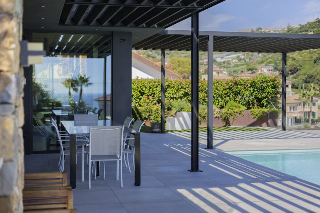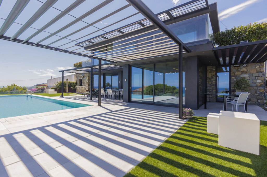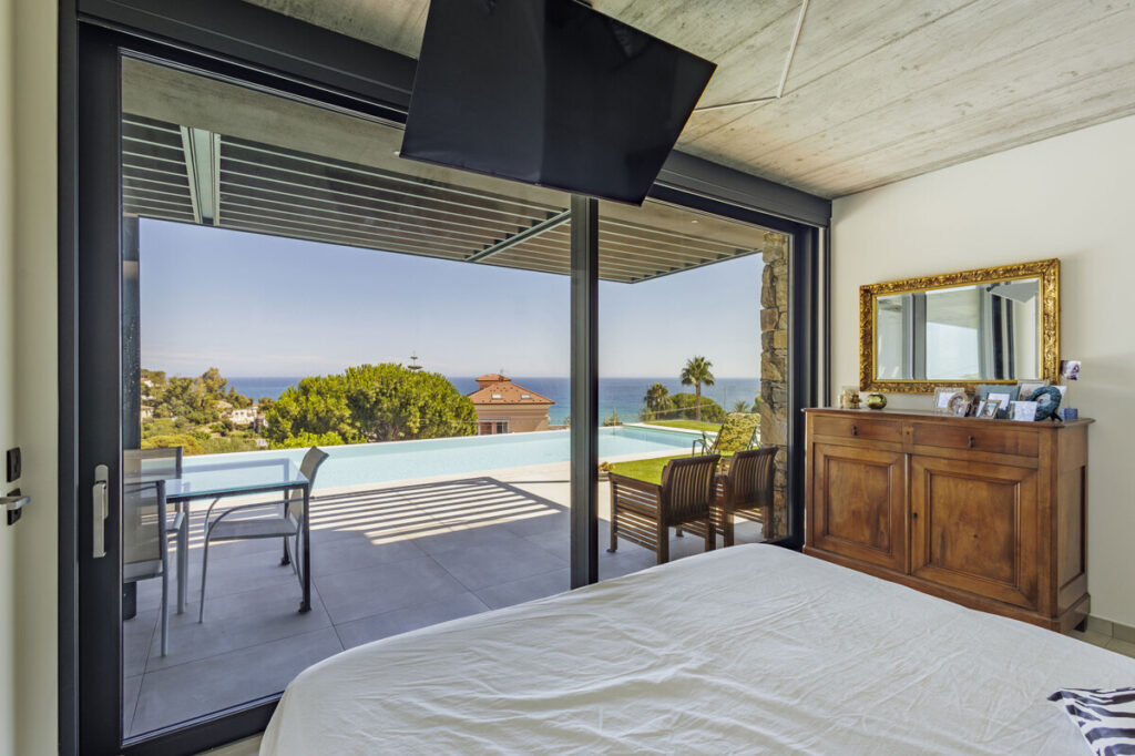 In hervorragender Lage in Ospedaletti, eingebettet zwischen mediterraner Vegetation und dem blauen Meer, befindet sich diese Villa an der italienischen Riviera zum Verkauf (Entfernung zum Meer: 600 m). Die moderne Architektur besticht durch klare Linien und große Glasschiebetüren, die Innen- und Außenbereich nahtlos miteinander verbinden. Das Anwesen erstreckt sich über drei Ebenen und verfügt über einen internen Aufzug. Das Herzstück des Hauses ist der Wohnbereich, der sich zu einer eleganten Außenterrasse und einem spektakulären Infinity-Pool mit Meerblick öffnet.