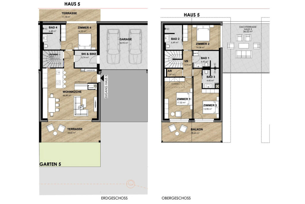 Chalet 5 erstreckt sich über 144,55 m² und und bietet ein exklusives Wohngefühl. Im Erdgeschoss haben Sie die Wahl ob Sie einen privaten Wellnessbereich mit Sauna und gemütlichem Ruheraum wünschen oder ein zusätzliches Schlafzimmer brauchen. Der offene Wohn- und Essbereich schafft eine harmonische Verbindung zur Natur – dank der großen Fensterfront mit Zugang zur Terrasse und Garten.