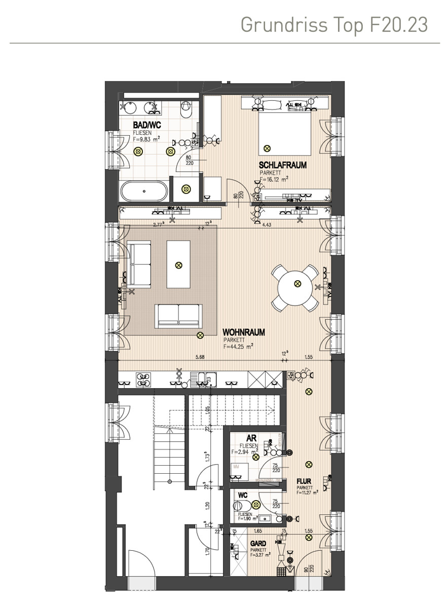 Die zum Verkauf stehende Wohnung verfügt über 89,56 m² Wohnfläche, die praktisch aufgeteilt ist in einen Eingangsbereich mit Garderobe, Gäste-WC und Abstellraum, von wo aus man in die Wohnräume gelangt. Der große und luftig wirkende Wohn-, Küchen- und Essbereich bildet den Mittelpunkt des traumhaften Appartements über den Dächern von Salzburg. Ein elegantes, zum Innenhof gelegenes Schlafzimmer schließt sich an und wird durch ein modernes Tageslichtbad komplettiert.