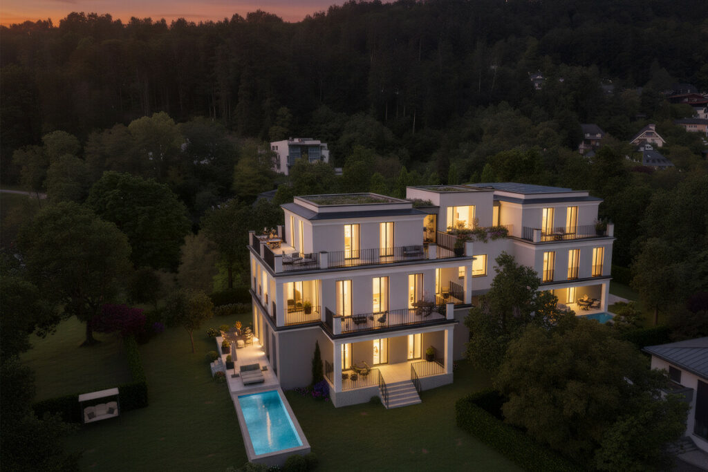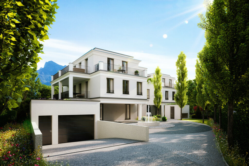 Ebenso beeindruckend sind die geplanten Außenbereiche: Gepflegte Gartenanlagen, stilvolle Wege aus Naturstein und eine repräsentative Einfahrt unterstreichen den luxuriösen Charakter des Anwesens.