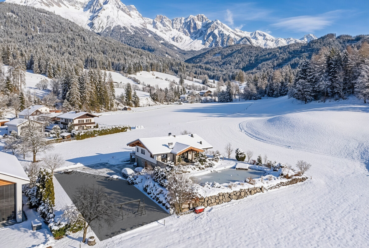 Das Grundstück befindet sich am Ende einer privaten Zufahrtsstraße, am Waldrand in Saalfelden im Ortsteil Ramseiden und glänzt mit einem fantastischen, freien Rundumblick auf das Steinerne Meer, das Kitzsteinhorn sowie auf die Gipfel der Leoganger Berge. Der großzügige Naturschwimmteich im Garten ist dabei weit mehr als ein gestalterisches Highlight: Er wird zum Mittelpunkt des Lebens im und ums Haus und schafft eine ganz besondere Wohlfühlatmosphäre.