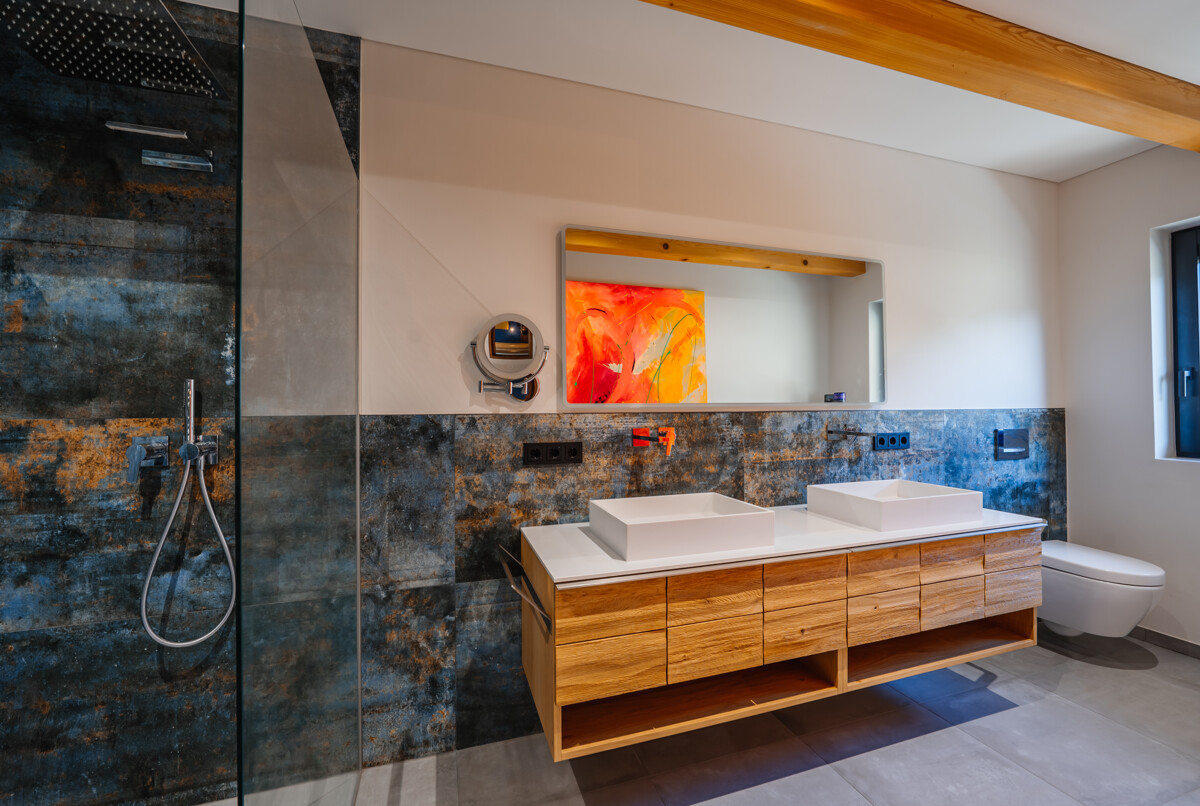 Im Obergeschoss erwarten Sie zwei weitere Schlafzimmer, von denen jedes über ein eigenes Bad verfügt. Der Masterbereich ist ein Highlight für sich: Er begeistert mit einer freistehenden Badewanne und einem direkt angeschlossenen, großzügigen Bad en suite, das mit einer luxuriösen Regen- und Wasserfalldusche verwöhnt. Das separate Gäste-Duschbad komplettiert die Etage. Alle Schlafzimmer verfügen über Raffstores und Fliegenschutz. Eine separate Gästetoilette ergänzt diese Ebene.