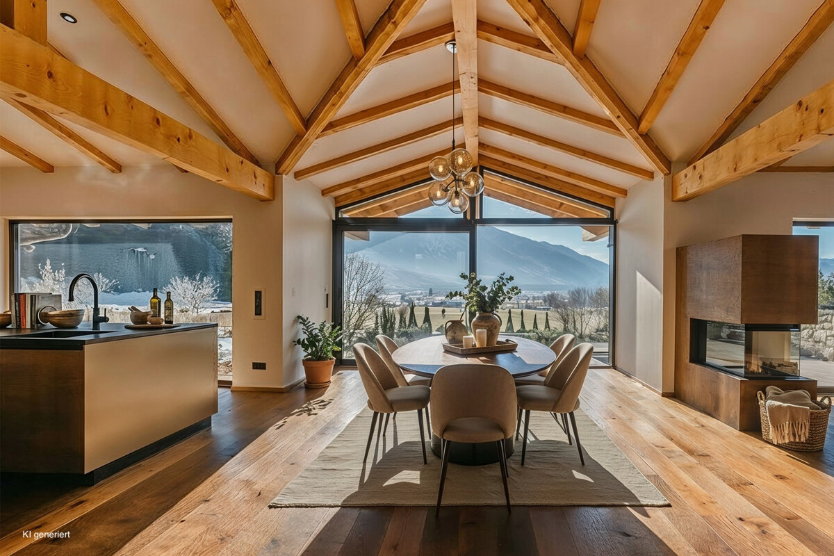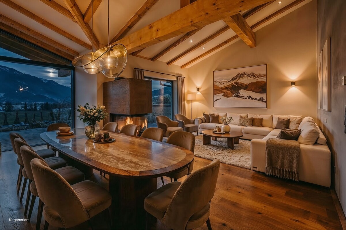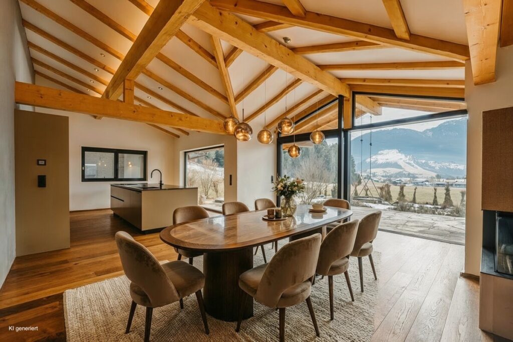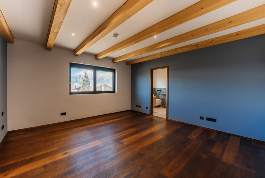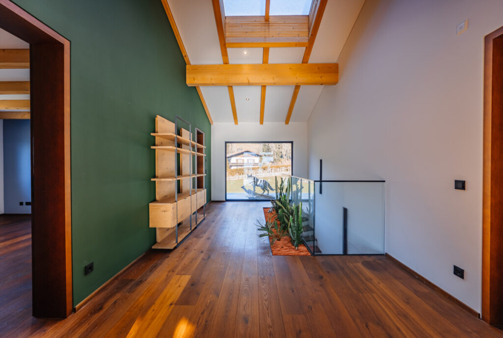 Das Obergeschoss öffnet sich lichtdurchflutet mit einem großzügigen Platzangebot. Ein heller Vorraum mit bodentiefen Fenstern verbindet Wohn- und Schlafbereiche und setzt mit einer beleuchteten Edelstahlpflanzwanne sowie einem großen Außenfenster mit kunstvoll inszeniertem Wolfobjekt aus Treibholz stilvolle Akzente. Sicht-Holzbalken im gesamten Obergeschoss verleihen dem Haus seinen alpinen Charakter und strahlen eine warme, natürliche Gemütlichkeit aus.