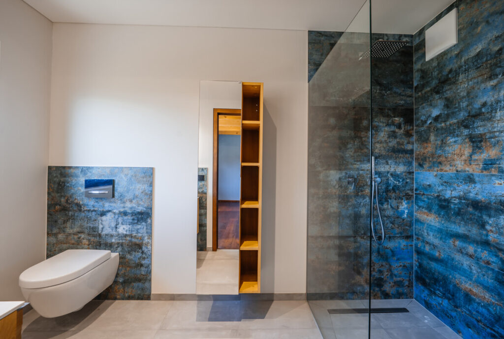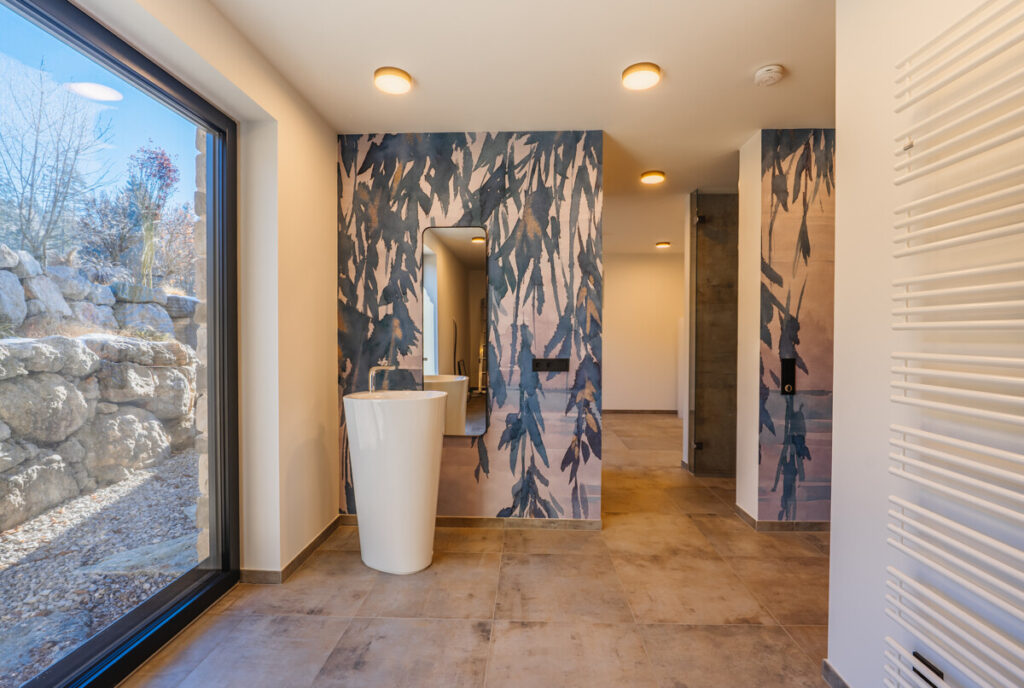 Viel Spielraum für individuelle Ideen eröffnet ein weiterer Teil des Erdgeschosses. Zwei offen miteinander verbundene Räume sind bereits so vorbereitet, dass sich hier mit wenig Aufwand ein privater Wellnessbereich realisieren lässt. Eine eigene Dusche sowie ein separates WC sind vorhanden, ein Anschluss für eine Sauna ist vorbereitet. Besonders stimmig ist der direkte Zugang über eine Außenstiege zum Schwimmteich – perfekt für alle, die sich ein Zusammenspiel aus Wärme, Wasser und Natur wünschen.