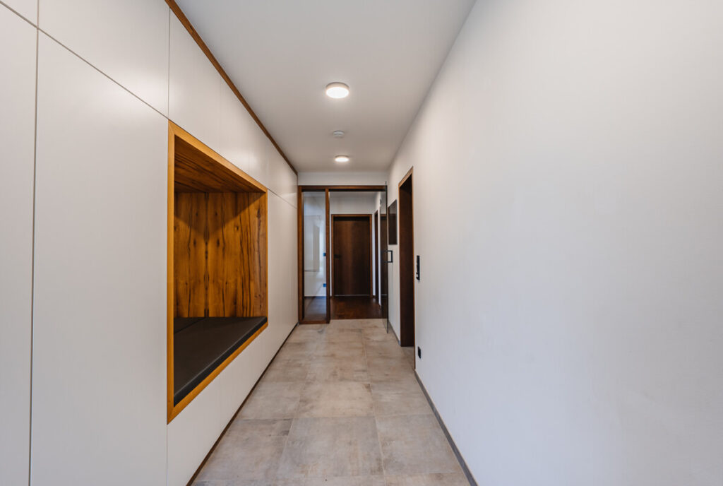 Auf rund 255 m² Wohnfläche verbindet das Haus Offenheit mit angenehmen Rückzugsmöglichkeiten. Großzügige Glasflächen, hochwertige Materialien und eine klare Raumführung schaffen ein lichtdurchflutetes, ruhiges Wohngefühl. Der Eingangsbereich sorgt mit einer maßgefertigten Garderobe mit integrierter Sitzmöglichkeit für ein stilvolles Entree und bildet den Auftakt zur ruhig gelegenen Erdgeschossebene.