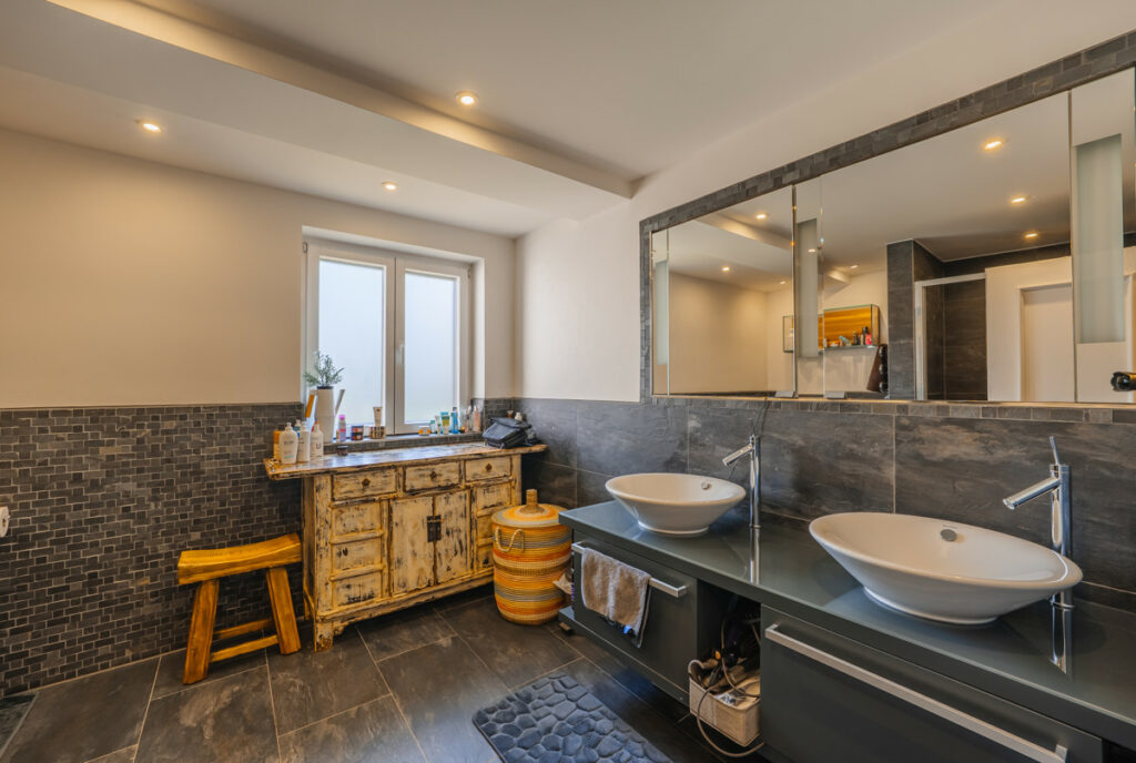 Der andere Flurzweig führt zu einem großen Badezimmer mit Dusche, Badewanne und WC – viel Platz, stilvoll gestaltet. Am Ende dieses Flurs befindet sich ein weiteres Gästezimmer mit eigenem Badezimmer inklusive Dusche und WC – ideal für Besucher oder Familienmitglieder, die ihren eigenen Bereich genießen möchten.