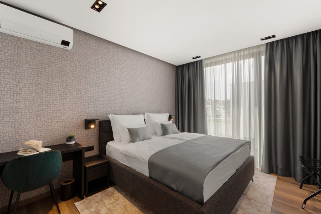Die Sauna ist eine luxuriöse Ergänzung, die nach einem langen Tag zum Entspannen und Erholen einlädt und dabei hilft, Stress abzubauen und neue Energie zu tanken. Eine Vaillant Luft-Wasser-Wärmepumpe sorgt für Heizung und Kühlung, betrieben mit elektrischer Energie. In allen Wohnbereichen gibt es Fußbodenheizung mit separaten Reglern für Zimmer und Badezimmer. Zusätzlich ist das Anwesen mit einem Samsung Multi Split-System ausgestattet, das mit zwei Außengeräten und sechs Innengeräten für eine angenehme Raumtemperatur sorgt. Diese Geräte verfügen über die Wind-free™-Technologie für eine sanfte Luftzirkulation und bieten die Möglichkeit der Fernsteuerung über WLAN.