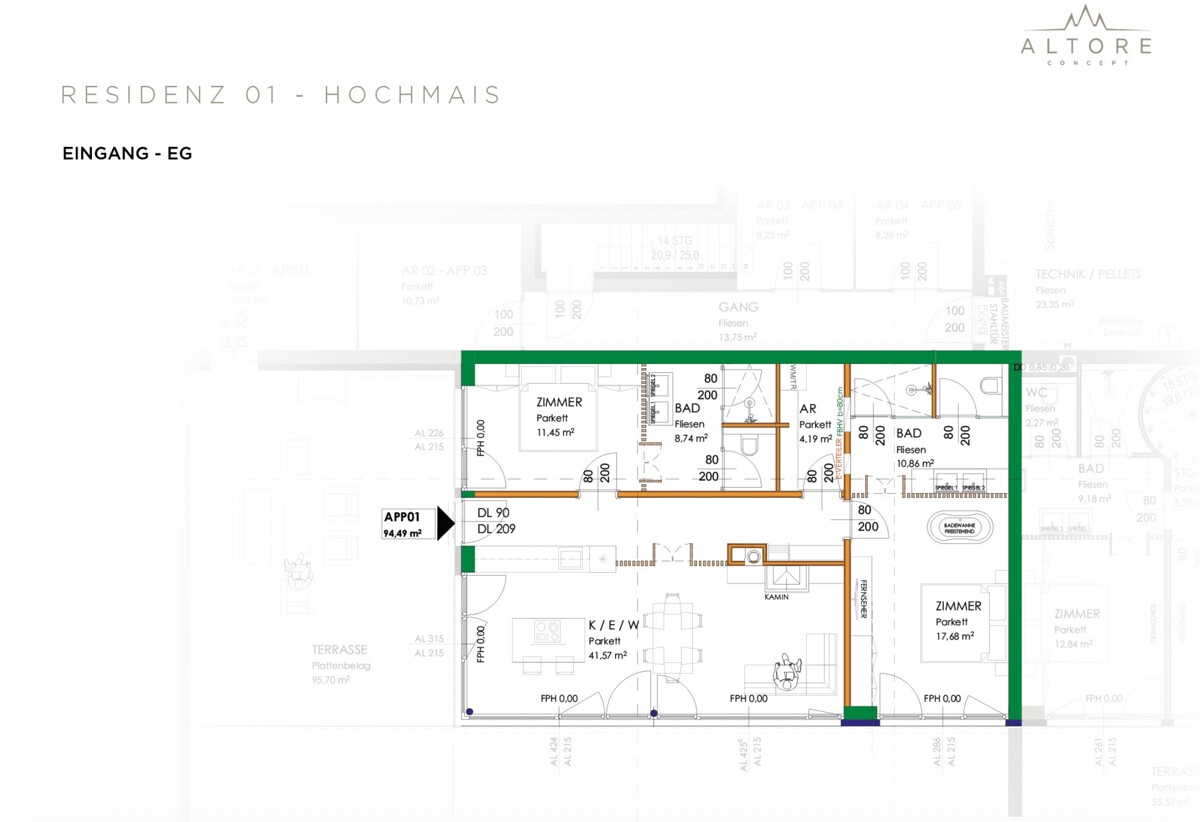 Die Wohnung Top 01 „Arthur“ befindet sich im Erdgeschoss und bietet auf 94,49 m² Wohnfläche komfortables Wohnen mit viel Raum für Rückzugsmöglichkeiten vom Alltag. Besonders hervorzuheben ist die 95,70 m² große Terrasse mit einem direkten Zugang ins Grün. Sie bietet jederzeit angenehme Momente an der klaren, frischen Bergluft und eignet sich ideal zum Entspannen, Frühstücken oder für gesellige Abende mit Familie und Freunden.