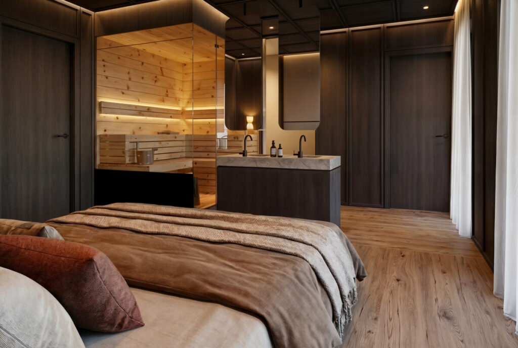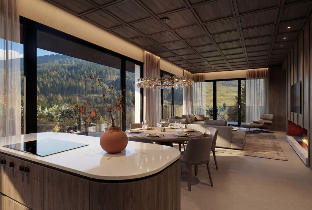 Auf Wunsch kann die Wohnung mit dem Interieurkonzept von Bernd Gruber ausgestattet werden – klare Linien, natürliche Materialien und handwerkliche Präzision, abgestimmt auf die alpine Umgebung. Optional sind Sonderausstattungen wie eine private Sauna oder ein Hotpot möglich.